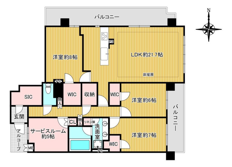 | 設備 | 都市ガス、上水道、下水道、ガスキッチン、トイレ、バス・トイレ別、シャワー、洗面所、洗面台、室内洗濯機置場、エアコン、床暖房、フローリング、2面バルコニー、収納スペース、ウォークインクローゼット、エレベータ、宅配ボックス、駐輪場、オートロック | ||